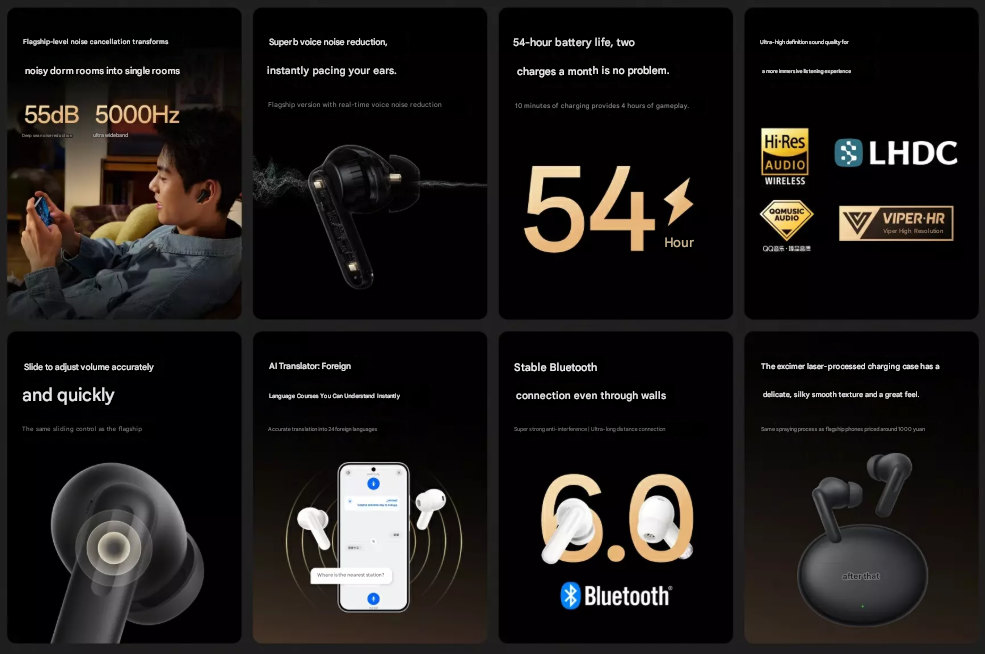 The earphones offer AI translation, IP55 ratings for dust and water resistance, and promises up to 54 hours of total battery life.