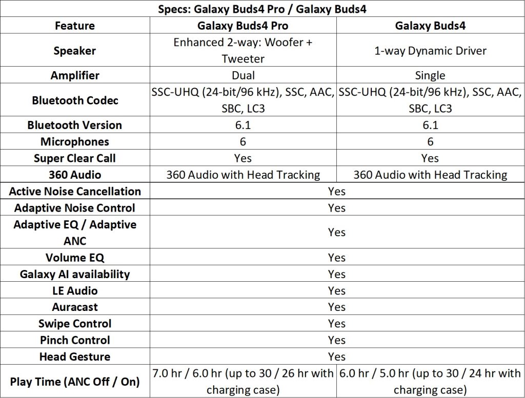 Quick Specifications: Galaxy Buds4 Series