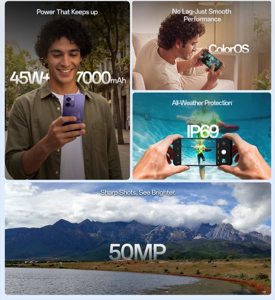 Marketed by the company as an “Endurance Powerhouse,” the core focus of the OPPO K14 5G is extended battery life. The smartphone is equipped with a massive 7000mAh battery, designed to support heavy usage and demanding daily routines without requiring frequent recharges. According to the official promotional material, this high-capacity battery is paired with 45W fast charging capabilities.