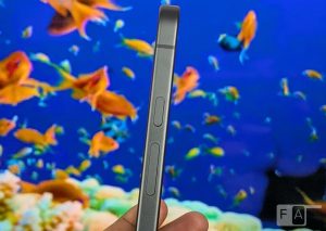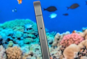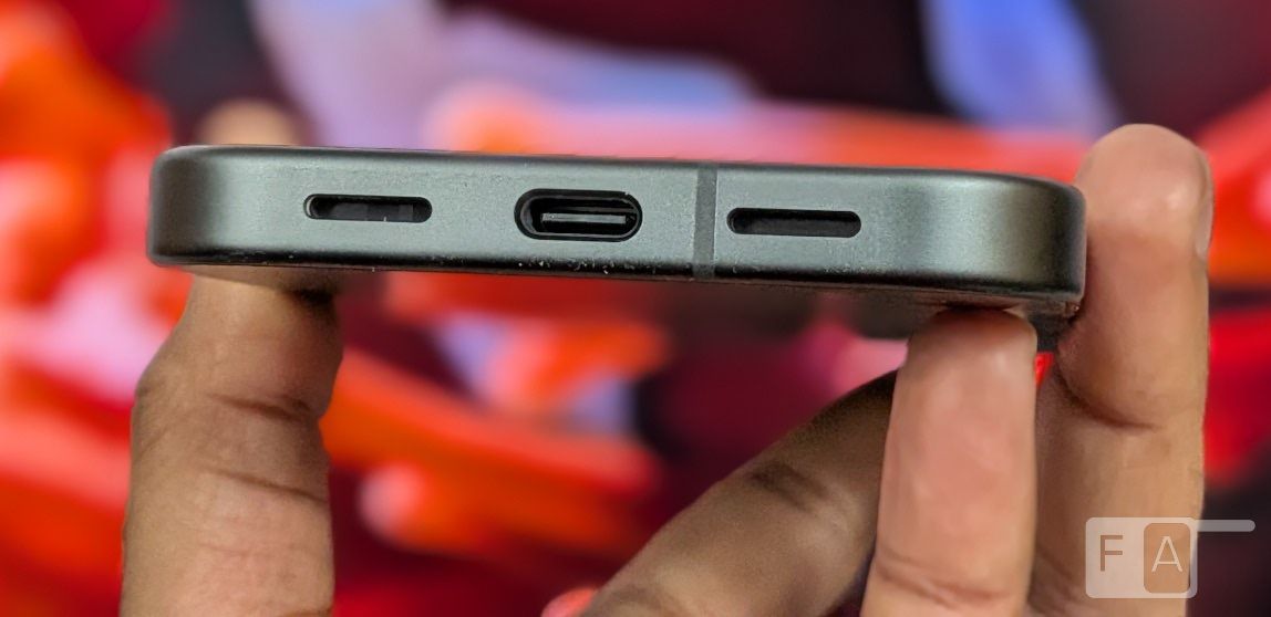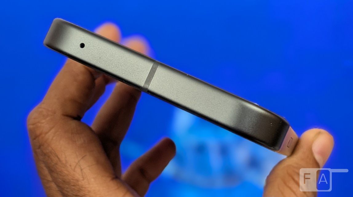 The phone has a flat metal frame, and you can see the antenna bands. The power button and volume rockers are present on the right side. The single SIM slot is present on the bottom, and the phone has eSIM support for the second SIM. The USB Type-C port, microphone and speaker grill are also present on the bottom. The secondary microphone is present on the top.