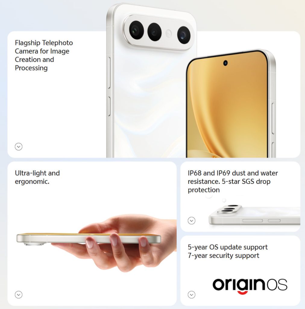 It packs a 6.31-inch 1.5K 120Hz LTPO AMOLED screen, is powered by the latest Snapdragon 8 Gen 5 SoC, features a 50MP main camera, an 8MP ultra-wide camera, a 50MP 3x periscope telephoto camera with a 1/1.95-inch large Sony IMX882 sensor and a 50MP front camera. It runs Android 16 with OriginOS 6, and the company has promised 5 years of OS updates and 7 years of security updates.