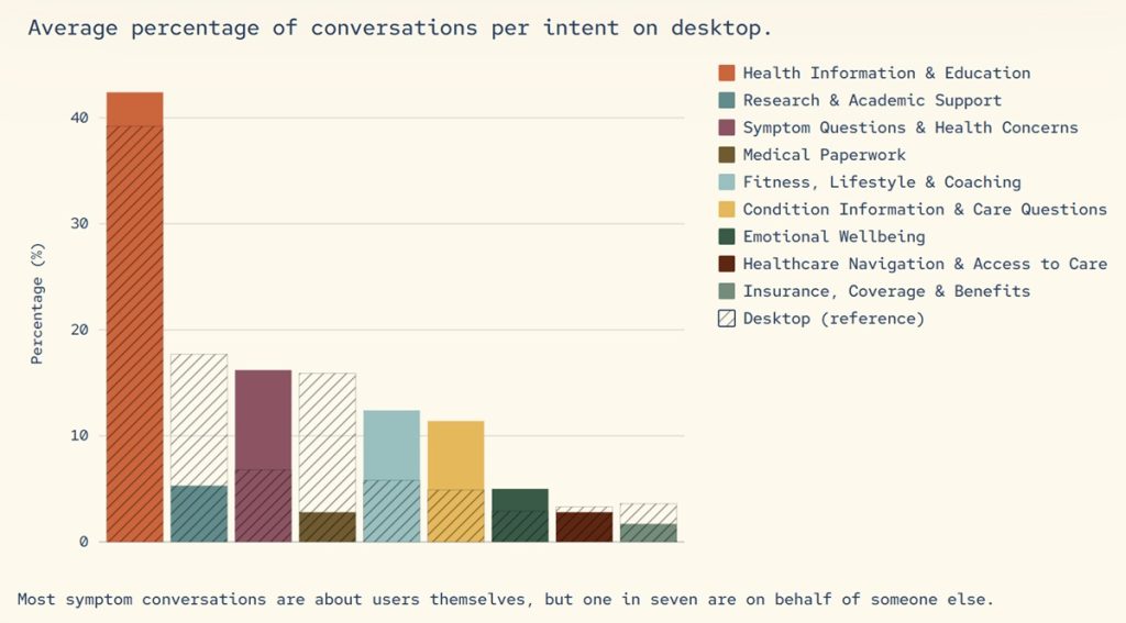• On desktop computers, health research and academic tasks are three times more common, often involving students, researchers, or healthcare professionals