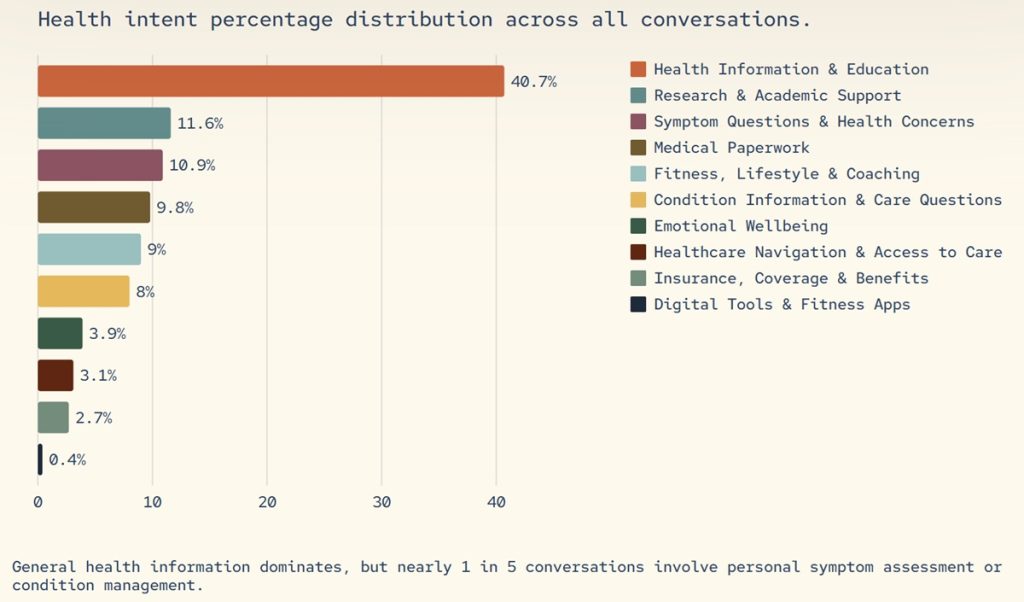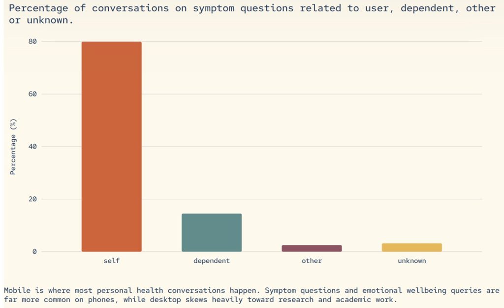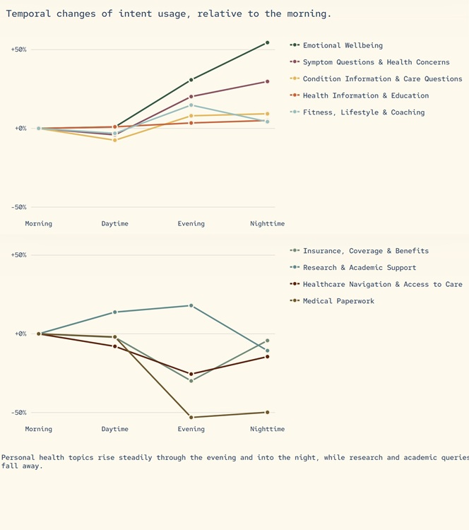 Symptom-related questions also rise at night, indicating users often turn to AI when clinicians, pharmacies, or other sources are unavailable.