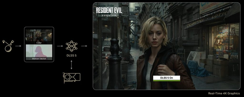 DLSS 5 uses a game’s color and motion vectors for each frame as input. Its AI model applies photoreal lighting and material effects that remain consistent with the original 3D scene, operating deterministically in real time.