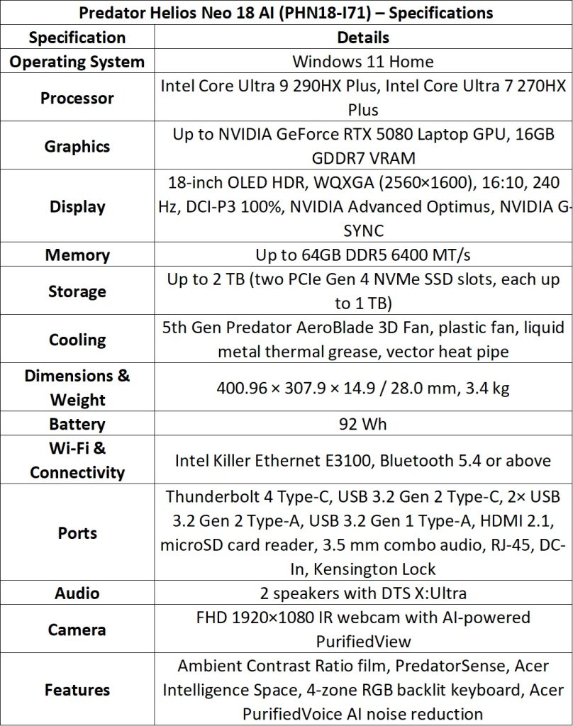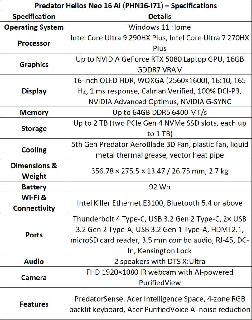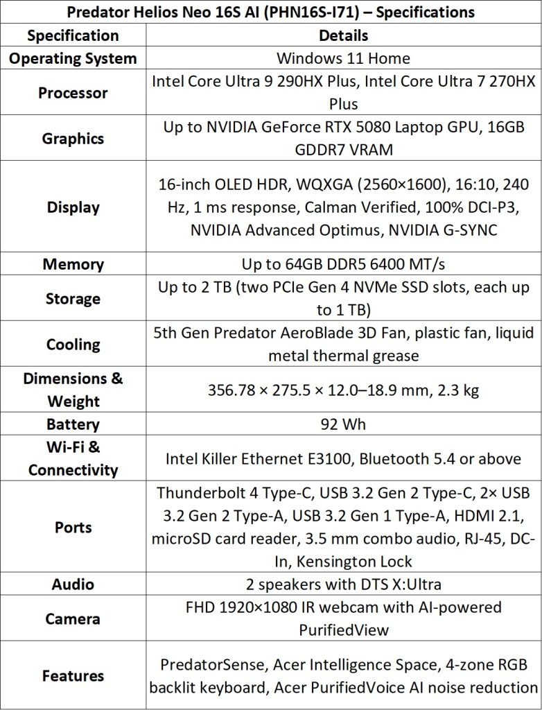 The Predator Helios Neo 16S AI is a slim gaming laptop with a chassis under 18.9 mm. It is equipped with an Intel Core Ultra 9 290HX Plus processor and an NVIDIA GeForce RTX 5080 Laptop GPU. The 16-inch OLED HDR display offers WQXGA resolution, a 240 Hz refresh rate, 1 ms response time, and Calman Verified 100% DCI-P3 color coverage.