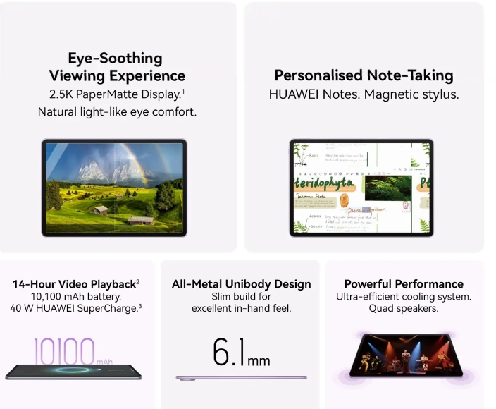 This model was released last year in global markets. It runs on HarmonyOS 4.3, offers up to 256GB of storage and 8GB of RAM, and features a 13MP rear camera and an 8MP front camera. The highlight of the tablet is its PaperMatte display, which uses anti-reflection coatings to eliminate 99% of light interference and reduce screen reflection by 60%.