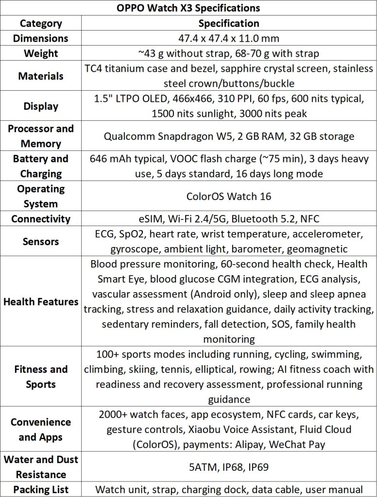 OPPO Watch X3 with 1.5″ LTPO OLED screen, Snapdragon W5 chip, titanium case, 5ATM water resistance, and eSIM support announced