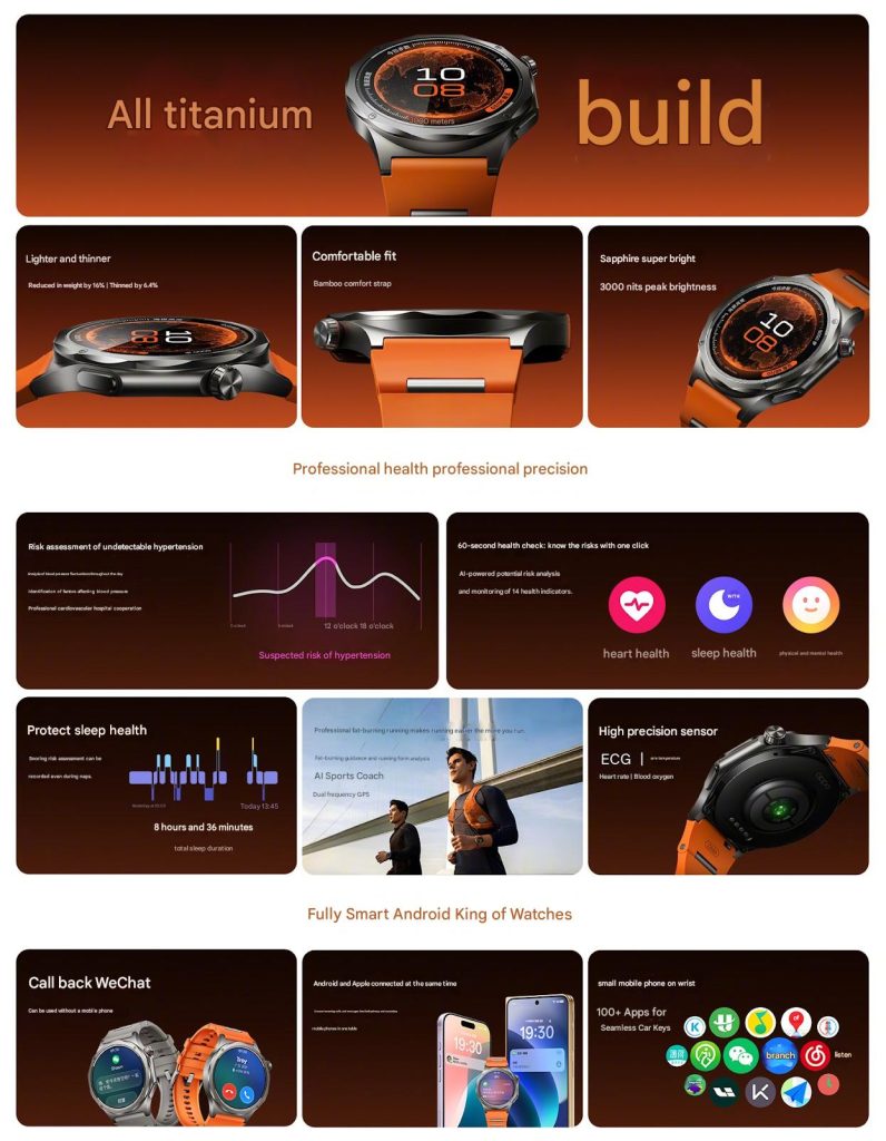 It features an ultra-transparent sapphire crystal lens (Mohs hardness >8) and a 1.5-inch LTPO display with 3000 nits peak brightness, a 36% increase, maintaining clarity under direct sunlight. The TC4 titanium alloy is rated at 950 MPa. The Watch X3 is IP68/IP69 water and dust resistant and has passed 16 military standard tests (MIL‑STD‑810H).