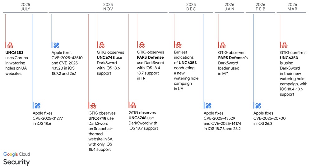 GTIG reported the vulnerabilities to Apple in late 2025. All are patched by iOS 26.3 (most earlier). Kernel fixes landed in 26.1, with RCEs in later releases. Devices on iOS 26.3.1 or 18.7.6 (at the time of publication) are not affected by observed variants.