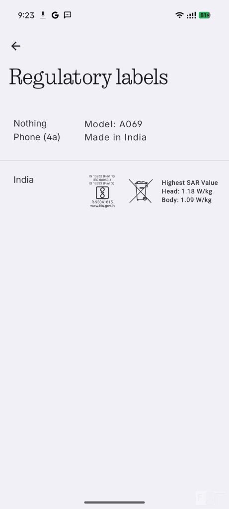 The Nothing Phone 4a’s body SAR is 1.09W/Kg and head SAR is at 1.18/Kg which is almost similar to Phone (3a) and is well under the limit in India, which is 1.6 W/kg (over 1 g).