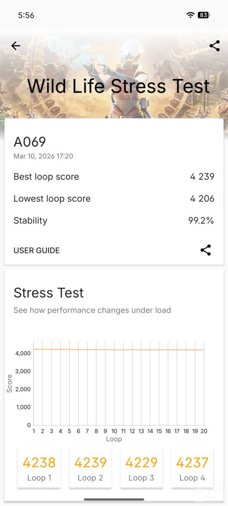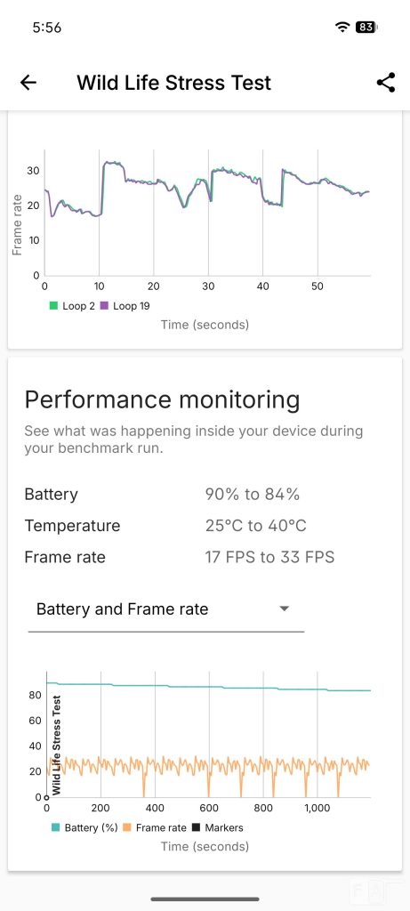 In 3D Mark wild life stress test, it scored 99.2%, which is good. The temperature increased from 25 to 40 degrees, which is slightly more than the 3a. That said, check out some synthetic benchmark scores below.
