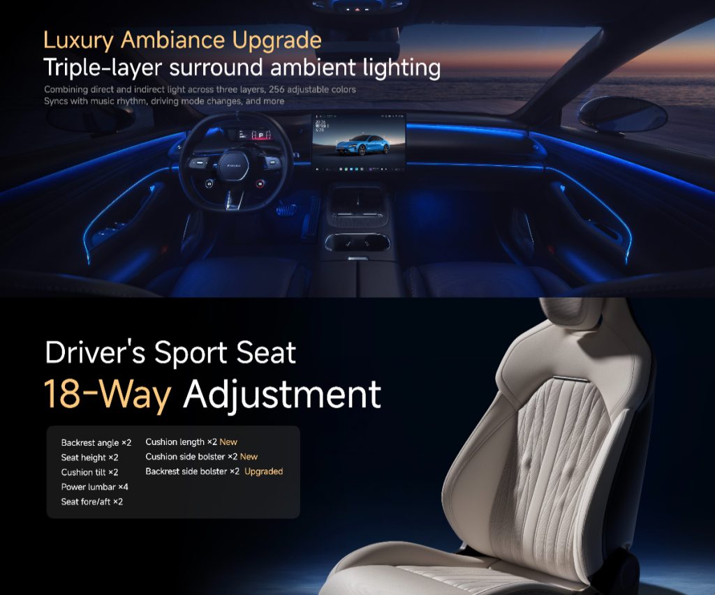 Ambient lighting extends 3,636 mm around the cabin. The system supports split-tone settings, music sync, and door-open warning functions.