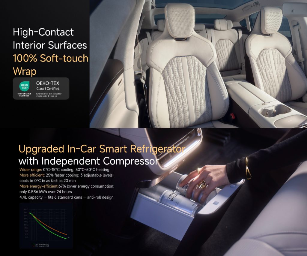 Rear seats: Longer bolsters, +20 mm foam, recline up to 121°, and concave sleep-optimized headrests enhance comfort for long journeys.