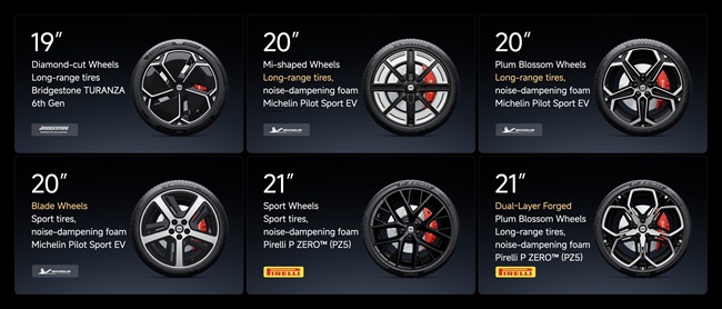 Six wheel options include three new designs: 19″ Diamond Cut, 20″ Blade, and 21″ Forged Dual Plum Blossom rims. Classic choices include 20″ Plum Blossom, 20″ Mi-shaped, and 21″ Sport rims.