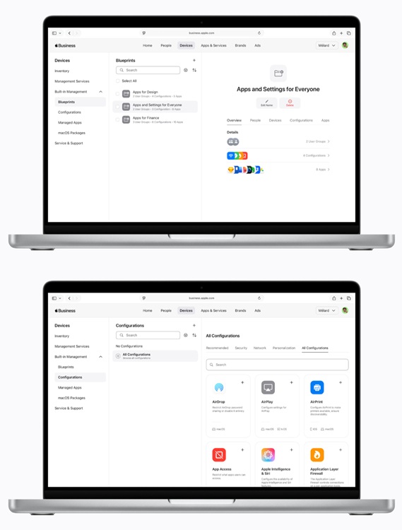 Apple Business integrates mobile device management (MDM), offering a centralized view of devices, settings, and apps. Key capabilities include:
