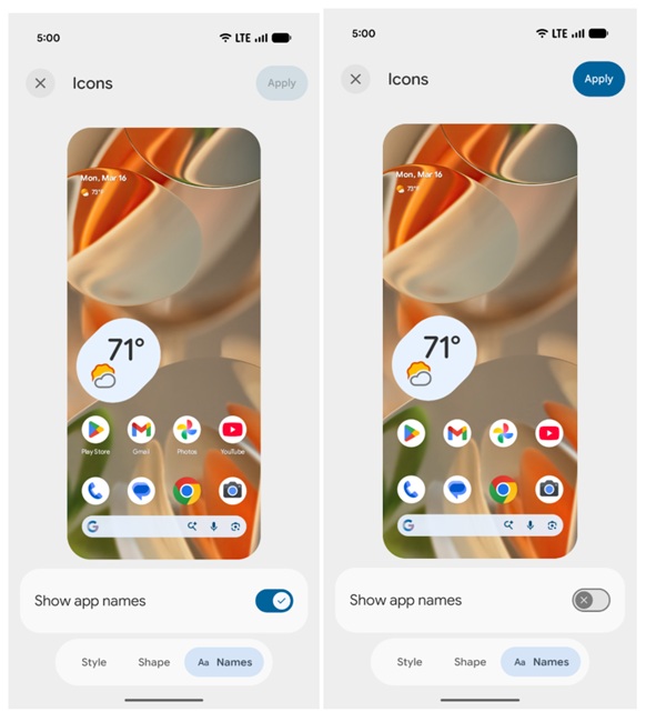 - Hidden app labels: Users can optionally hide app names on the home screen.