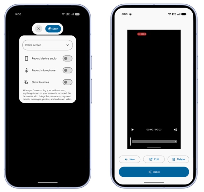- Redesigned screen recording toolbar: Updated system UI for recording controls.