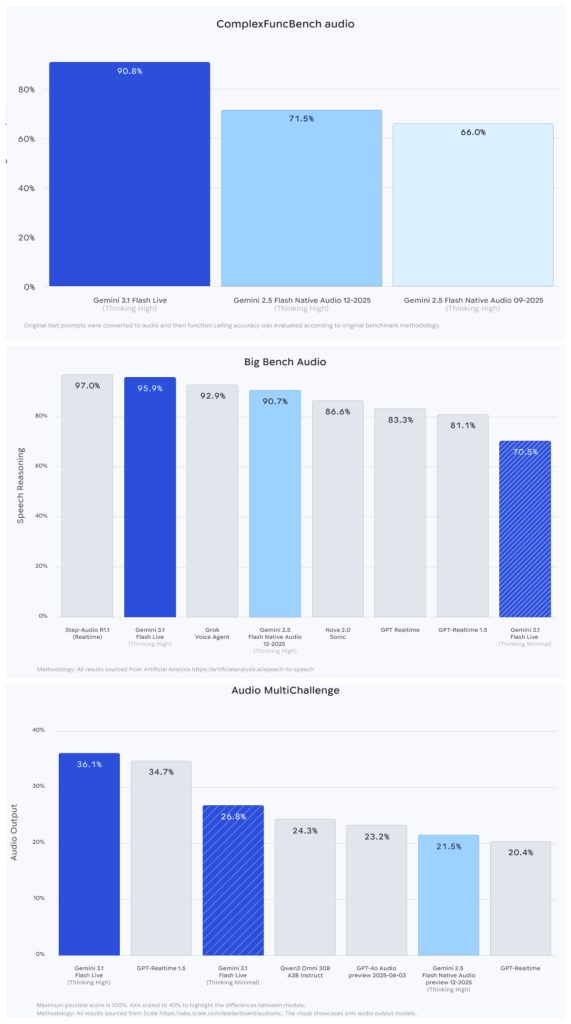 - ComplexFuncBench Audio: Gemini 3.1 Flash Live achieves a score of 90.8% on multi-step function calling with various constraints, outperforming earlier models.