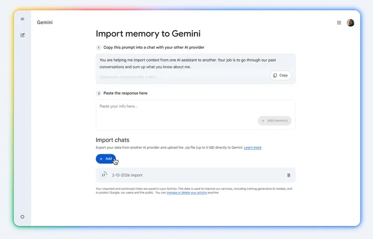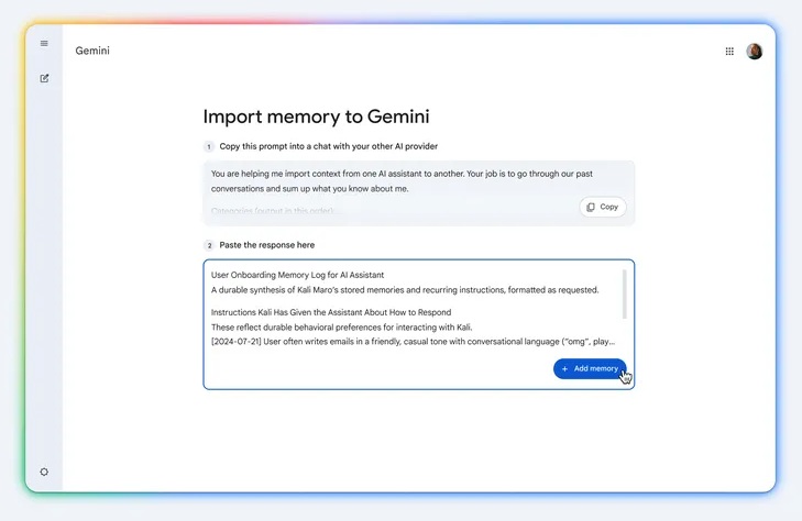 Google is introducing new switching tools for consumer accounts that allow users to bring their memories, context, and chat history from other AI applications into Gemini. The update is designed to help users avoid starting from scratch when moving to a new assistant, while enabling Gemini to understand prior preferences and conversations from the beginning.