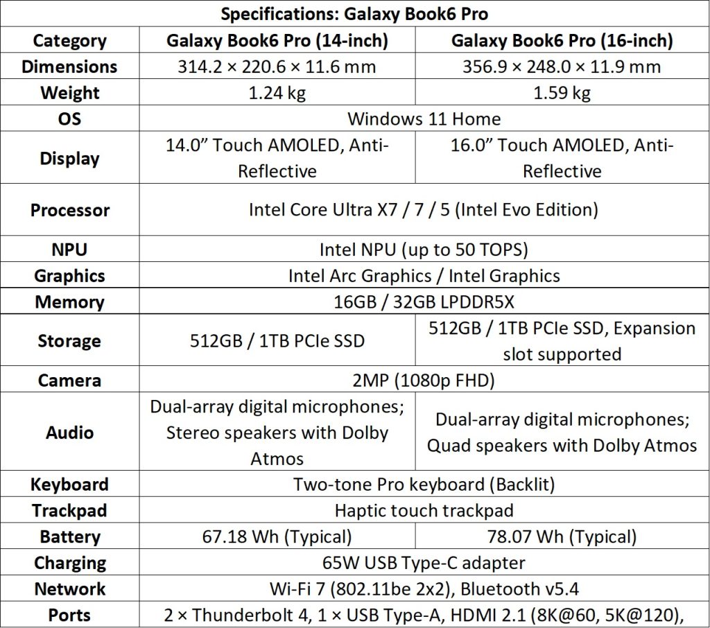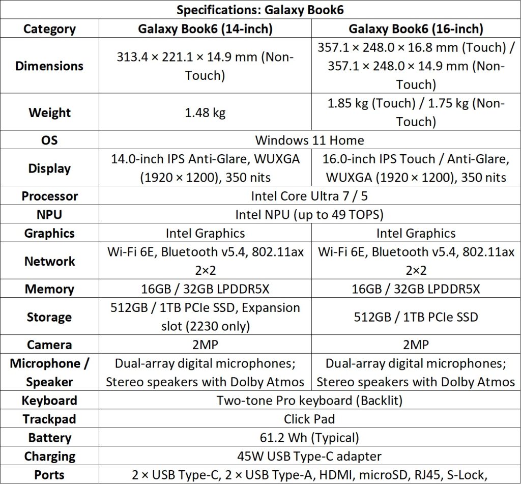 Quick Specifications: Galaxy Book6 series