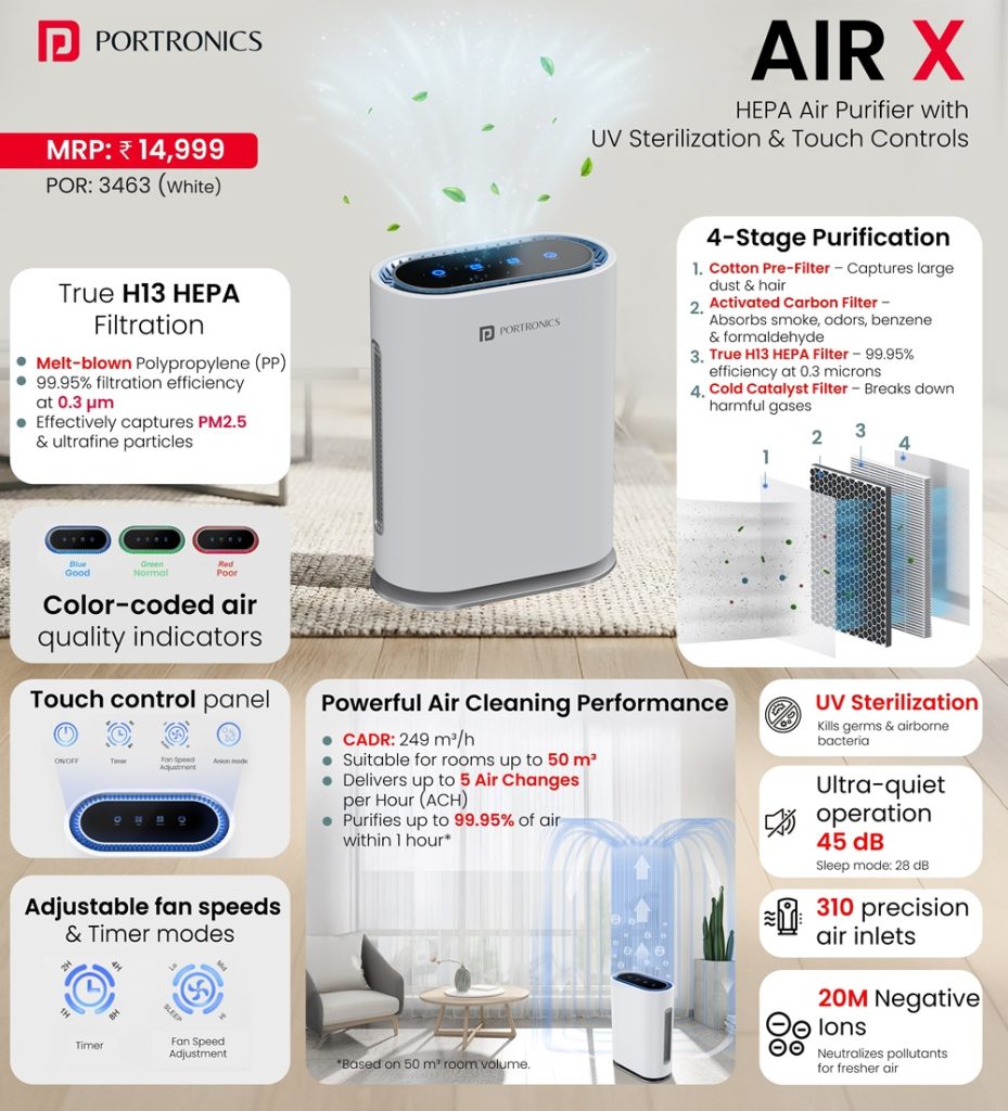Portronics has announced its entry into the air purifier category with the launch of the AIR X, a smart HEPA-based air purifier designed to improve indoor air quality for homes and workspaces.