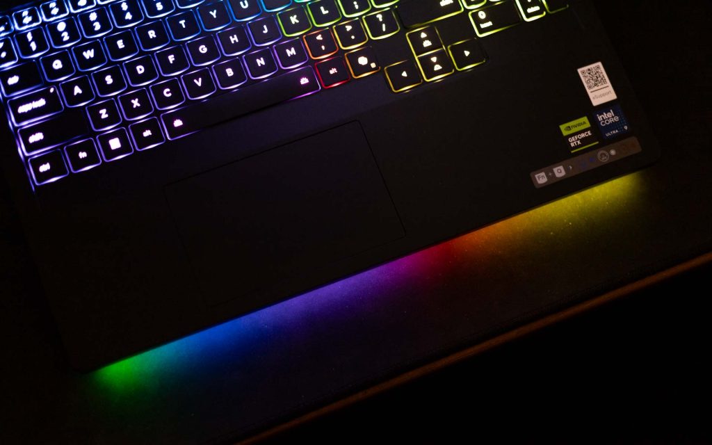 As you would expect from a flagship gaming laptop, RGB lighting is present in abundance. The Legion Pro 7i features per-key RGB on the keyboard, an RGB-lit Legion logo on the lid, and diffused RGB underglow along both the front and rear edges of the chassis that gives it a distinctive look in a darkened room. All of these can be controlled individually through the Lenovo Spectrum app, and there are keyboard shortcuts to cycle through presets quickly.