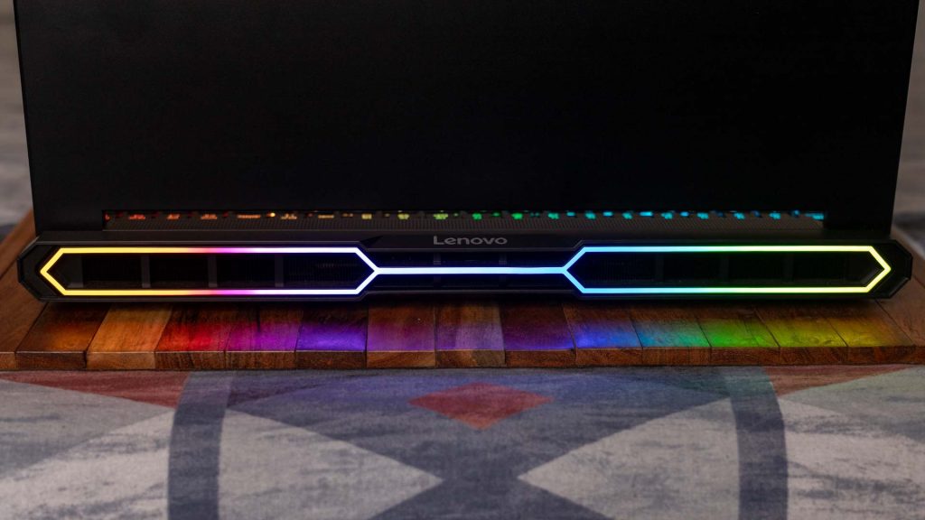 The rear of the chassis is dominated by large exhaust vents, flanked by an RGB light bar arrangement that genuinely does remind you of something out of a sci-fi film. Unlike some older Legion models, there are no ports on the rear edge, and given that this machine is expelling close to 300W of heat out the back, that is probably for the best. Anything plugged in there would get uncomfortably hot in short order.