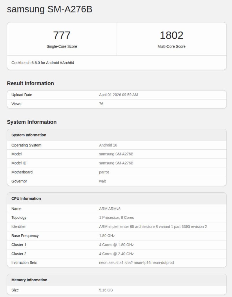 The Samsung Galaxy A27, with the model number SM-A276B and the successor to last year’s Galaxy A26, has surfaced in the Geekbench benchmark.