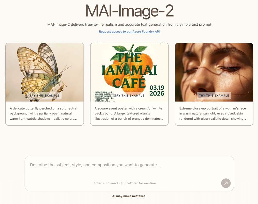 MAI-Image-2 is Microsoft’s text-to-image generation model designed for creating high-quality visuals from text prompts. It focuses on photorealistic outputs, improved text rendering within images, and better handling of complex layouts and scenes.