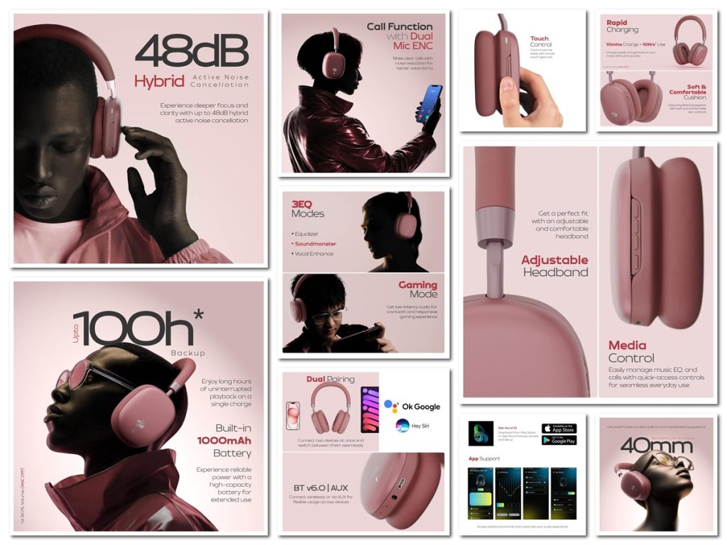 The headphones are equipped with dual microphones with Environmental Noise Cancellation (ENC) for clearer voice calls and a low latency gaming mode to reduce audio delay during gameplay or media playback. They offer a 1000mAh battery providing up to 100 hours of playback with ANC off, along with fast charging that gives 10 hours of use with just 10 minutes of charge.