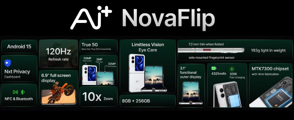 The phone operates on Android-based nxtQ OS, a custom user interface that the brand states is designed with a specific focus on user privacy and intelligent features. The Ai+ Nova Flip 5G is equipped with a 4,325 mAh battery, which the promotional material states is intended to support an all-day power cycle.