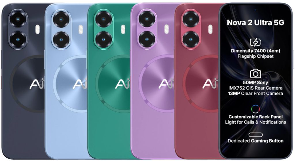 The Ai+ Nova 2 Ultra 5G has a 6.78-inch 1.5K 144Hz AMOLED screen, is powered by the MediaTek Dimensity 7400 SoC with up to 8GB of RAM, and also has VC cooling. There is a Sony IMX752 50MP camera with OIS and design-led customization, including dynamic lighting that responds to calls and messages.
