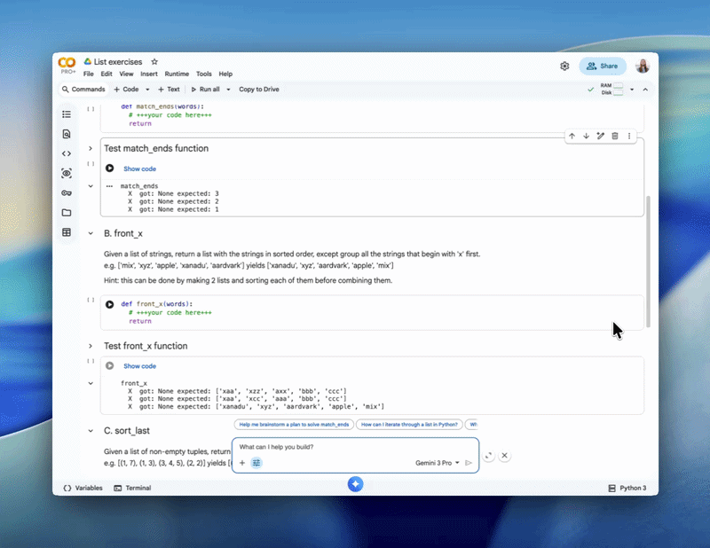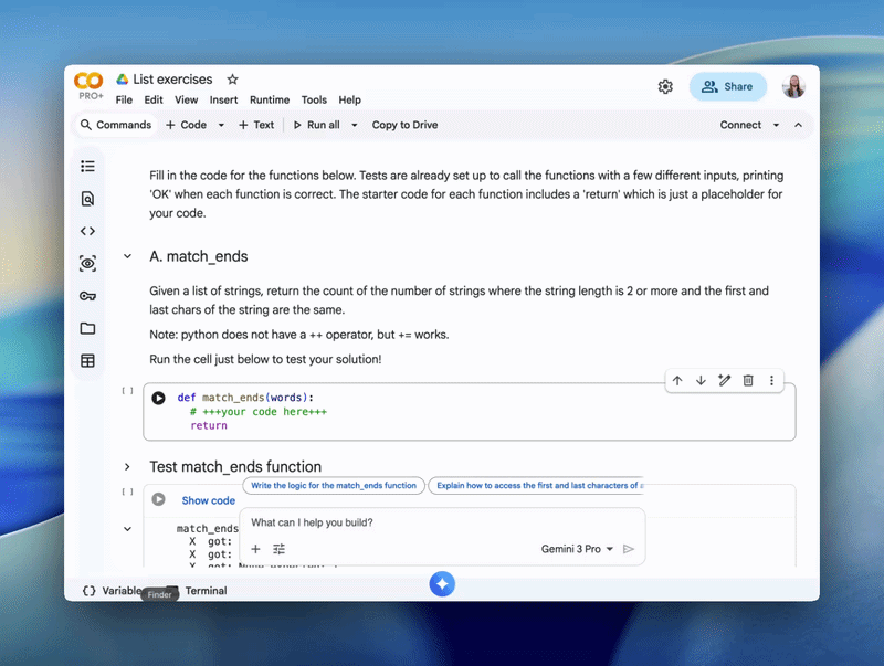 Google Colab includes example notebooks where Gemini is preconfigured with Learn Mode. Users can start a chat with the assistant and follow guided exercises, including Python-based tasks such as list and string exercises.