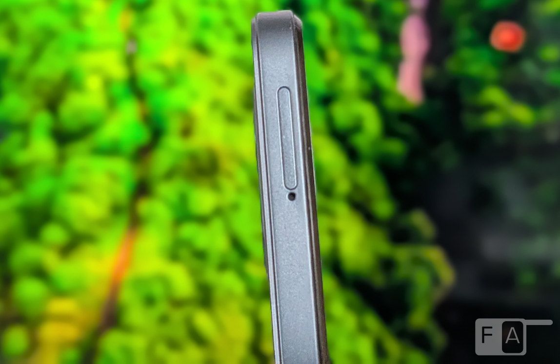 The phone has a power button and the volume rockers on the right side; the dedicated dual SIM and microSD card slot are on the left; the 3.5mm audio jack, microphone, USB Type-C port, and speaker grill are on the bottom. There is nothing on the top.