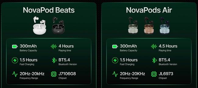 NovaPods Air is a true wireless earbud model with up to 22 hours of total playback time. It features quad-mic Environmental Noise Cancellation (ENC) for calls and supports 50ms low latency. The earbuds have an IPX5 rating for resistance against sweat and splashes.
