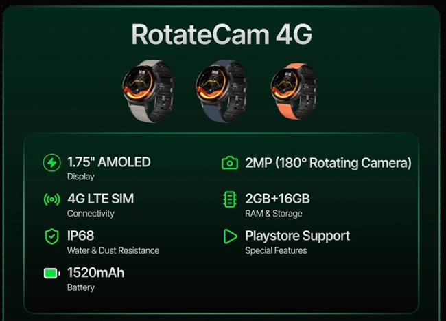 RotateCam 4G is a smartwatch with a rotating camera. It supports 4G LTE calling without requiring a paired smartphone. The device includes GPS support and access to apps via the Play Store. It is equipped with 2GB RAM and 16GB internal storage. It has a 1520mAh battery and carries an IP68 rating for dust and water resistance.