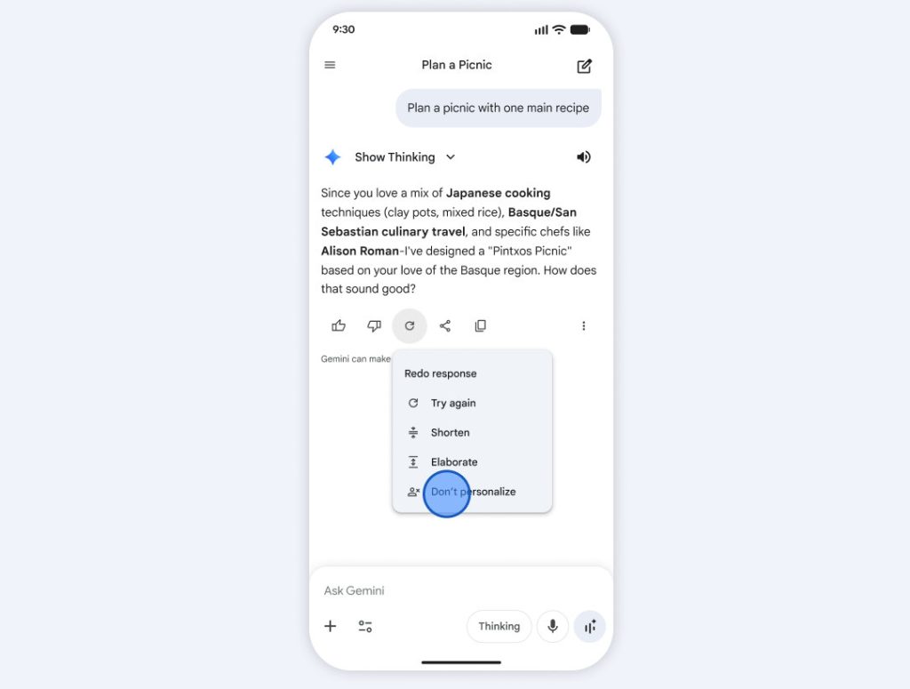 - Google encourages users to provide feedback on inaccurate or over-personalized responses using the “thumbs down” feature to assist in ongoing research and model improvement.