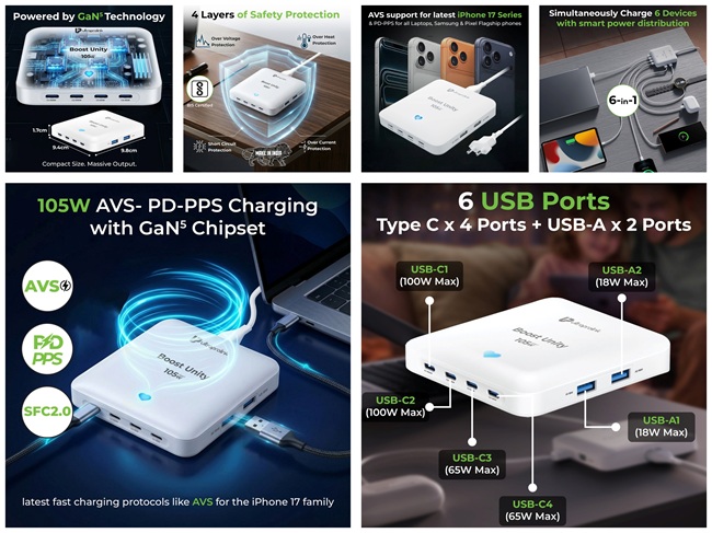 The Boost Unity 105W charging station uses a 5th-generation GaN chipset to deliver up to 105W total output with improved heat management and a compact design. It supports charging of up to 6 devices simultaneously through 4 USB-C ports and 2 USB-A ports. USB-C1 and USB-C2 support up to 100W output, USB-C3 and USB-C4 support up to 65W output, while USB-A ports support up to 18W each.