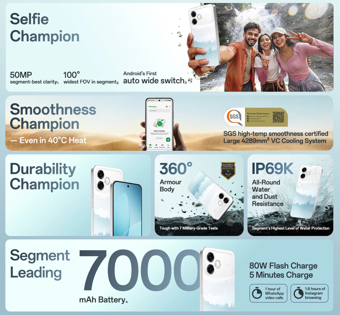 Durability extends to the core construction of the device through its “360° Armour Body” and “Diamond-Structured Build.”