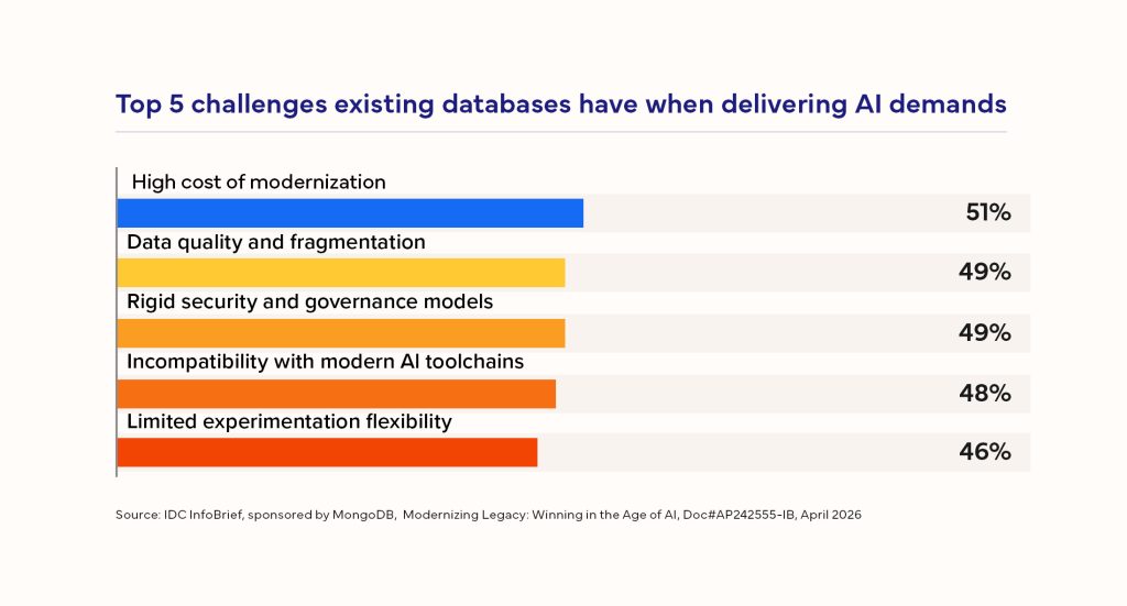A major barrier identified is data debt, where siloed and poor-quality data limits AI performance. Legacy relational databases are described as rigid, costly, and inefficient for AI workloads.