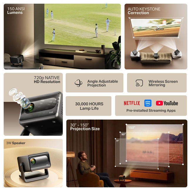 The CineHead E1 features native HD 720p resolution with support for 1080p playback and 150 ANSI lumens brightness. It supports up to 150-inch projection and runs on Android 13-based smart UI.