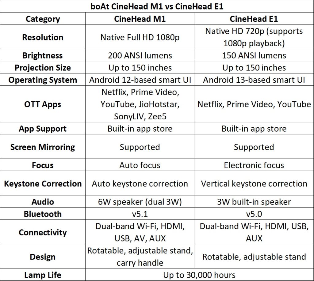 The boAt CineHead M1 is priced at Rs. 10,999, while the CineHead E1 is priced at Rs. 7,499. Both models come with a 1-year warranty and are available in India via Amazon.in.