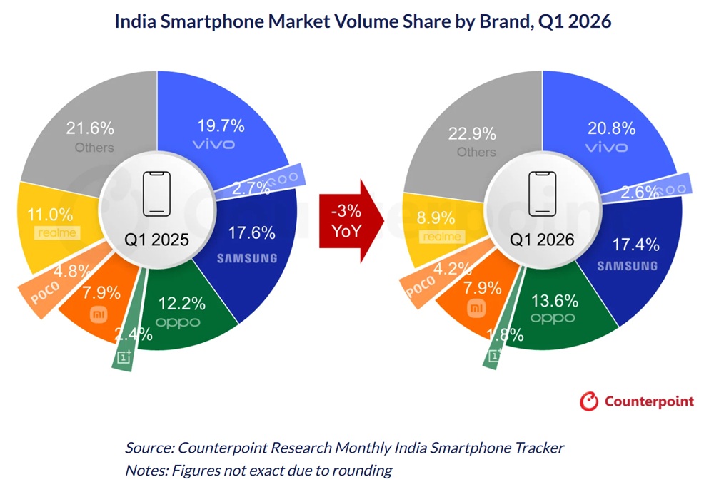 India’s smartphone shipments fell 3% YoY in Q1 2026 due to a combination of supply-side and demand-side pressures.
