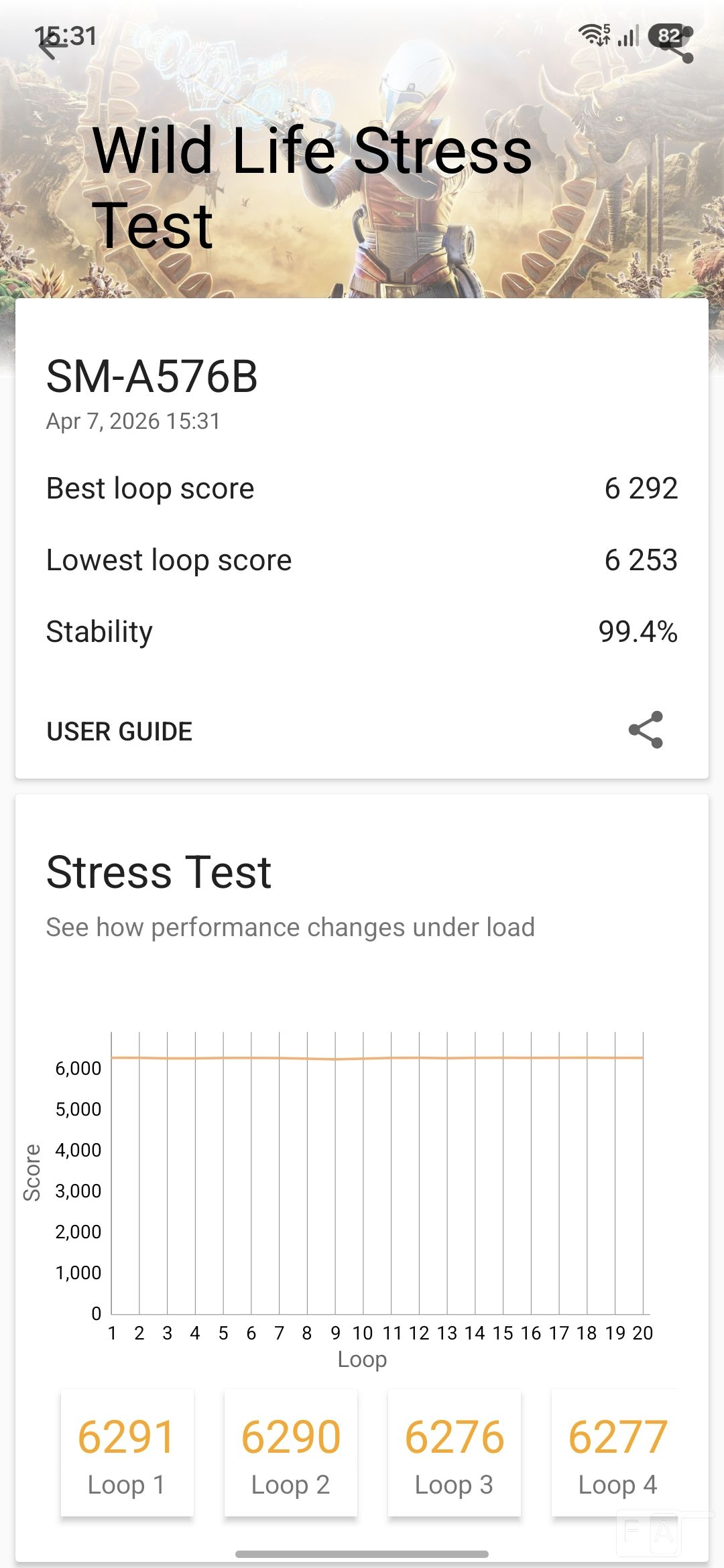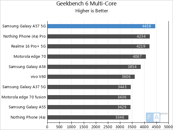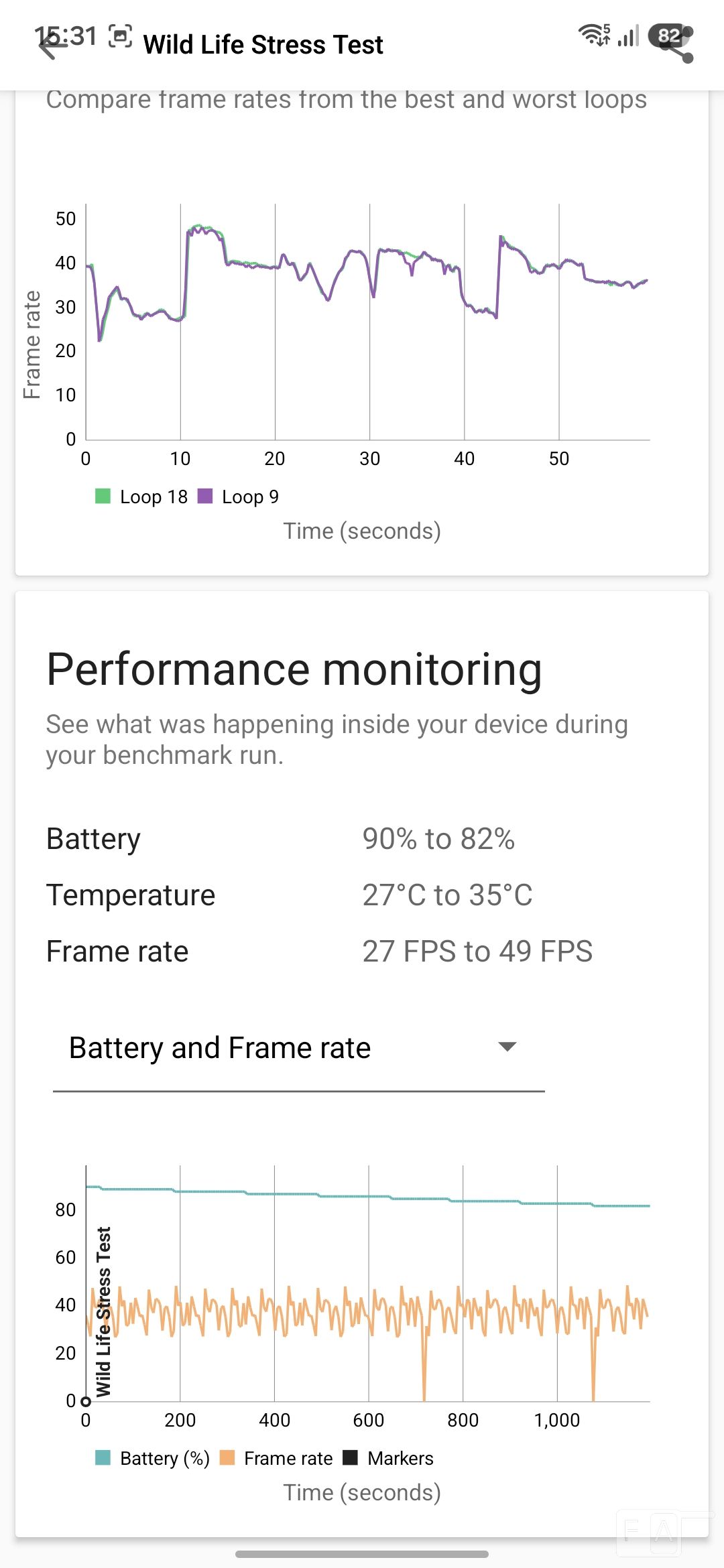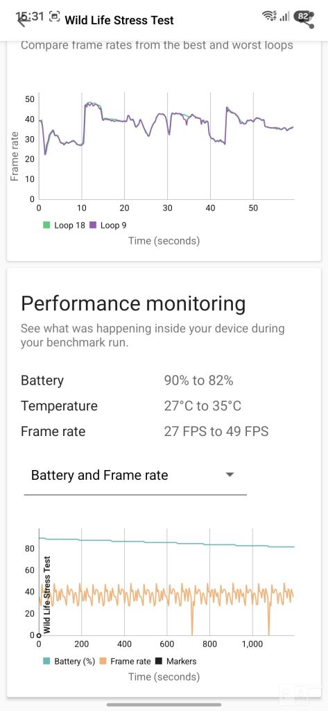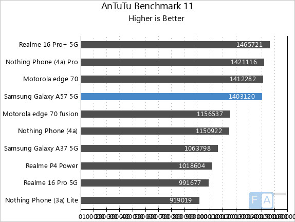 In the 3D Mark Wildlife stress test, it scored 99.4%, which is better than the A56%, and the temperature shot up from 27 to 35 degrees, which is lower, so the A57 definitely runs cool. That said, check out some synthetic benchmark scores below.