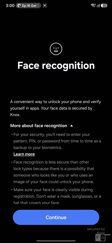 The phone has an in-display fingerprint sensor that immediately unlocks the phone even when the phone is locked. It is good, but not as fast as a physical fingerprint scanner. You can add up to 3 fingerprints, and adding fingerprint is easy. It has support for face recognition, which doesn’t work well if the lighting is poor in the room or if you are wearing hats or heavy makeup. Both these are protected by Knox security.