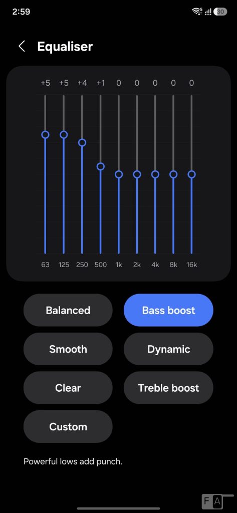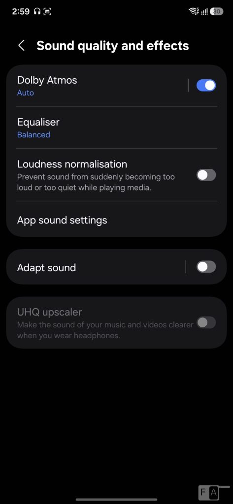 YouTube Music is the default music player. It has equalizer, Dolby Atmos, UHQ upscaler, and Adapt that can be enabled from the settings. All these improve the audio when listening through earphones, and Dolby Atmos also works with speakers. It doesn’t have FM radio support. That said, audio through earphones is good. Loudspeaker output from the stereo speakers is good as well.