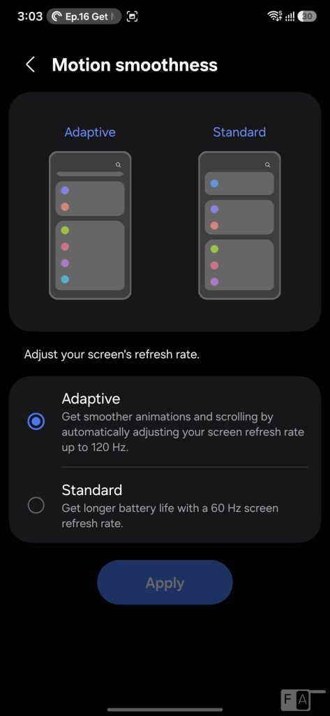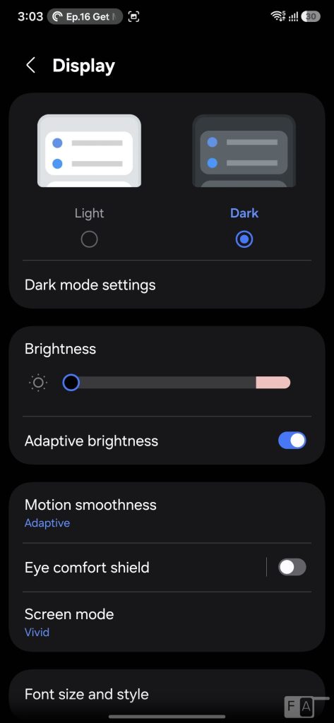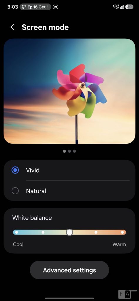 It has a 120Hz refresh rate screen that offers a fluid user experience with smoother animations, scrolling and gaming. Similar to the other Samsung phones, there is an Eye comfort shield that limits blue light emitted by the screen. There is also dark mode. You can choose from Vivid or Natural screen modes based on your preference or set the white balance manually.