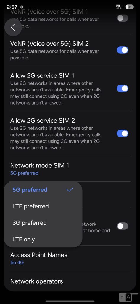 The Galaxy A57 5G has support for N1, N3, N5, N7, N8, N20, N28, N38, N40, N41, N66, N77 and N78 network bands in India. There is dual SIM 5G, and Airtel and Jio 5G works out of the box. There is also 4G Voice-over-LTE (VoLTE) and support for LTE-A or Carrier Aggregation and VoNR support for Jio. It also has eSIM support, but this disables the second SIM.