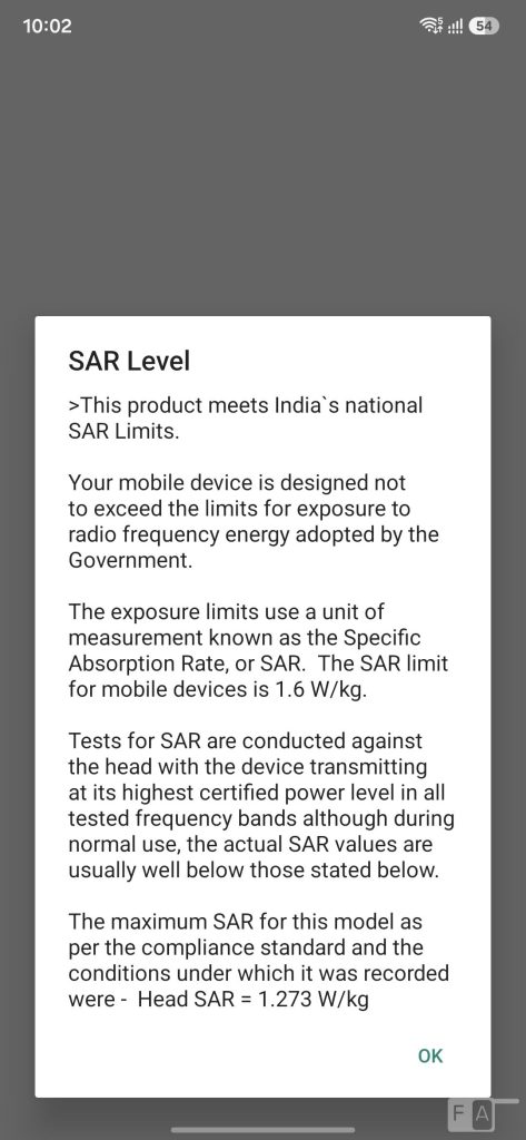 The Galaxy A57 5G’s head SAR is 1.273 W/Kg, which is slightly less than the A56, and is well under the limit of 1.6 W/kg (over 1 g) for India.