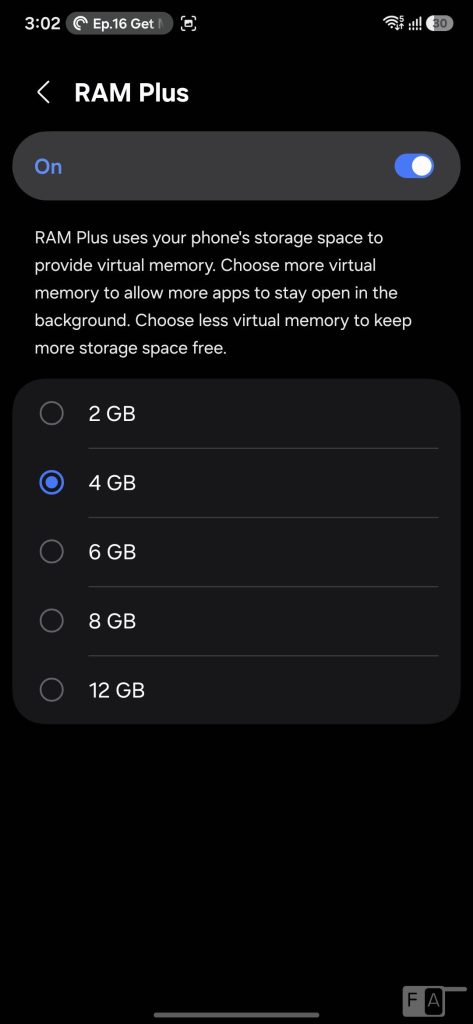 There is also a RAM Plus feature, which uses the internal memory of the phone to expand the RAM by an extra 8GB, in addition to the existing 12GB of RAM. This is enabled automatically, but you can turn it off.